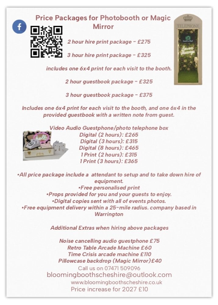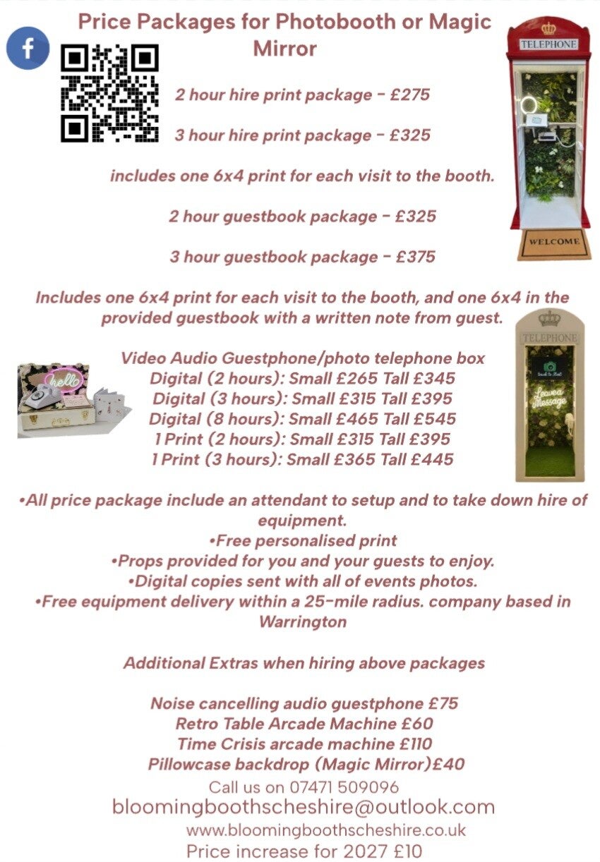 - Print & Digital Package (photos and video messages sent via QR code, Wi-Fi dependent, with on-site printing)