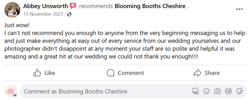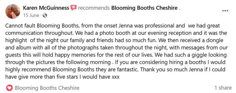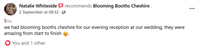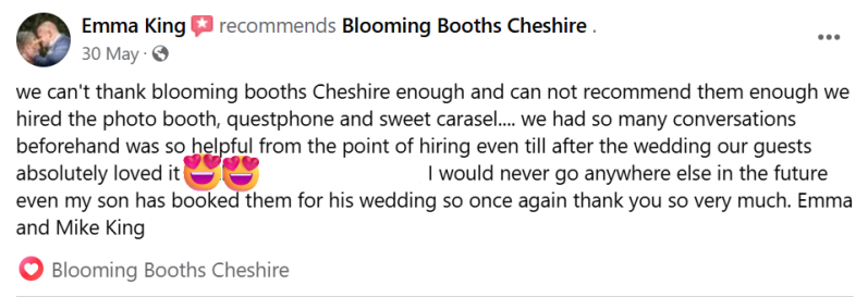 what an amazing service you provide i can't tell you how much me and my children enjoyed the booth at my sisters wedding. Big thank you to the attendant for making sure the camera was adjusted each time for the children. definitely will be using you for our wedding in 2025 .